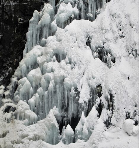 この日、玉簾の滝の水は まだ凍っておらず ツララ状態。時折、ツララがバキッと折れて落ちていく音が辺りに響いていました。 この写真は、落差63mという玉簾の滝の一部分。何だか浮世絵のようです。( 2019.2 玉簾の滝にて )