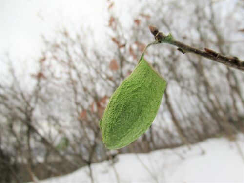 『ウスタビガ』という蛾の繭だそうです。 中は すでに空っぽです。 色といい、形といい、見事。 ( 2019.2 高館山にて )