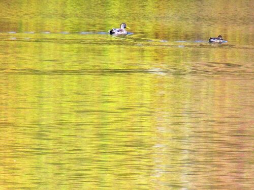 水面に映る紅葉の中を 静かに泳いで行く鳥たち。その跡が空色の筋になっていました。 ( 2019.10 鶴間池にて )