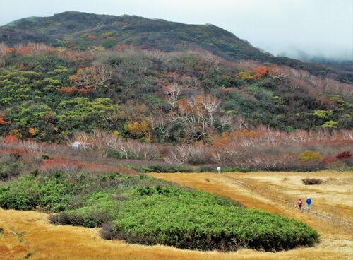 ガスがかかって鳥海山の山頂は見えず。 竜ヶ原湿原の木道を歩く人たちの姿が見えました。 ( 2019.10 鳥海山・祓川にて )